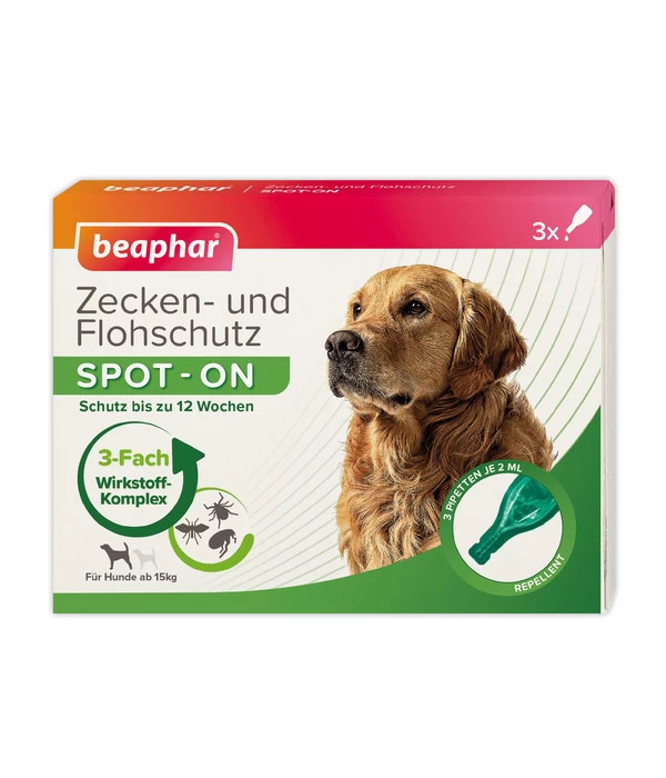 Der ideale Schutz für Hunde vor Zecken und Flöhen: beaphar Zecken- & Flohschutz SPOT-ON mit natürlichem Margosa-Extrakt. Geeignet für große Hunde ab 12 Wochen und ab einem Körpergewicht von 15kg. Das Hundezubehör bietet eine gute Alternative zu Ungezieferbändern oder anderen, rein chemischen Zecken- und Flohschutzpräparaten. Mit dem Inhalt einer kleinen Pipette können Sie die Parasiten bis zu einem Monat von Ihrem Vierbeiner fernhalten. Zudem hat das Hundezubehör fellpflegende Eigenschaften. Die Packung enthält 3 Pipetten mit je 2 ml und reicht insgesamt für 12 Wochen. Für Hunde kann der Geruch des Margosa-Extraktes u.U. unangenehm sein.
