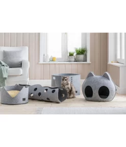 Die Liegeflächen bieten jeweils 30×30 cm Platz zum Ausruhen, Schlafen und Beobachten. Die plüschig weiche, gemütliche Wohnhöhle mit rundem Eingang ist der perfekte Rückzugsort am Kratzbaum für ein ausgedehntes Nickerchen. Doch nicht nur für die ruhigen Stunden hat der Cat Dream Kratzturm raumhoch etwas zu bieten: die fünf Holme aus Massivholz, die Bodenplatte und Liegeflächen von diesem Katzenkratzbaum verbinden, sind mit robustem Natursisal umwickelt und sind die optimale Anlaufstelle für ausgiebiges Krallenwetzen.