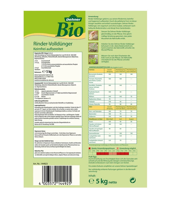 Jeder Dünger ist immer nur so gut, wie seine Anwendung. Beachten Sie also auf jeden Fall die Hinweise auf der Verpackung. Bei einer Neuanlage von Erdbeeren, Gemüse oder Blumen, Stauden und Rosen verwenden Sie ca. 250 g je m². Bei Rasen sind 150 g je m² ausreichend. Zur Nachdüngung bringen Sie dann 150 g bzw. 80 g je m² aus. Dehner Bio Rinder-Volldünger kann in der Zeit von März bis Oktober verwendet werden. Dehner Bio Rinder-Volldünger wird leicht in den Boden eingearbeitet und anschließend gewässert. Dabei werden in der ersten Vegetationsperiode ca. 40% des Gesamtstickstoffgehalts freigesetzt. Der Rest steht den Pflanzen dann in den folgenden Jahren durch mikrobielle Umsetzung zur Verfügung. Phosphat und Kalium werden zu 100% freigesetzt. Die Menge von 5 kg ist ausreichend für eine Fläche von ca. 30 m².