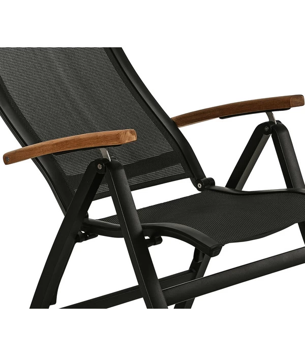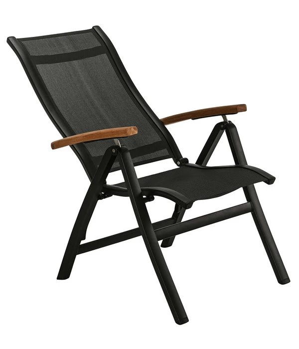 Sie lieben es, sich nach einem anstrengenden Arbeitstag zu Hause auf die Terrasse zu setzen, ein Weilchen in den Abendhimmel zu schauen und dabei zu spüren, wie der Stress des Tages von Ihnen abfällt? Dann werden Sie dieses Ritual bald noch mehr genießen, wenn der Dehner Klappsessel ‘Chicago Wood‘ auf Sie wartet. Die Kombination aus formschönem Gestell und luftiger Bespannung ist ebenso elegant wie komfortabel, während die Armlehnen aus naturfarbenem Teakholz die noble Note hinzufügen und mit angenehmer Haptik verwöhnen. Und wie bei hochwertigen Klappsesseln üblich können Sie auch bei diesem Modell die Rückenlehne mehrfach verstellen, so dass Sie stets die für Sie bequemste Position finden. Und brauchen Sie den Platz auf der Terrasse für andere Aktivitäten oder hat sich der Sommer verabschiedet, klappen Sie den Sessel mit einem Handgriff zusammen und stellen ihn platzsparend in die Ecke. Also, möblieren Sie jetzt Ihre Terrasse mit dem Dehner Klappsessel ‘Chicago Wood‘ – Sie werden viel schöne Sommer Freude daran haben.