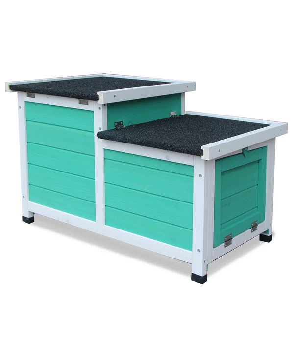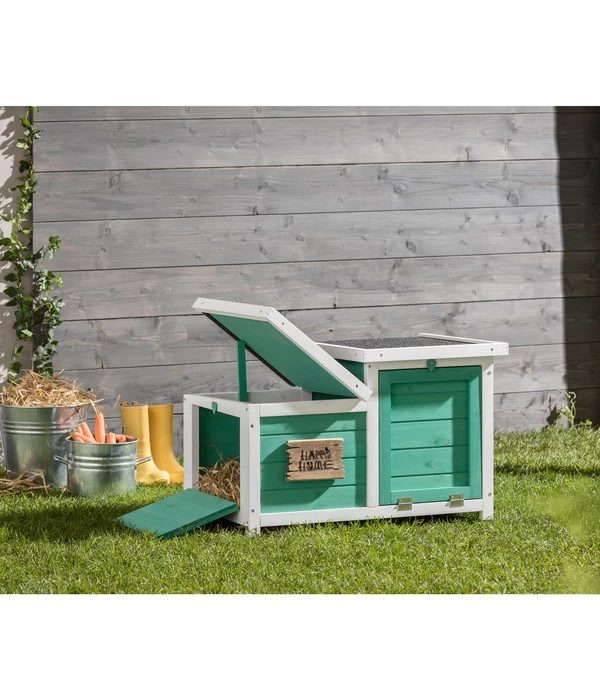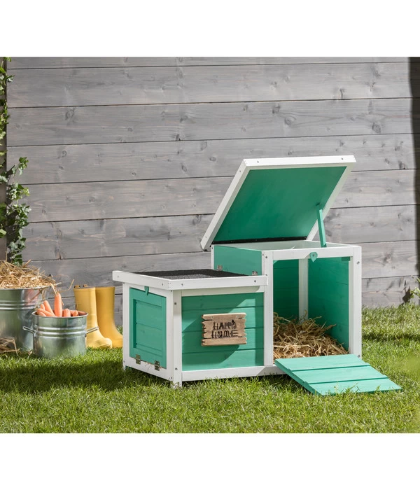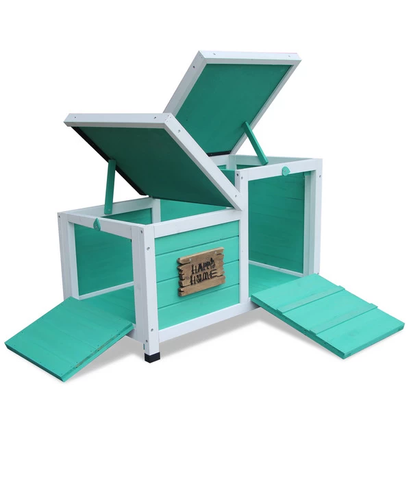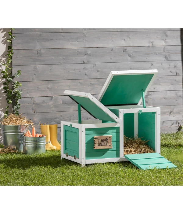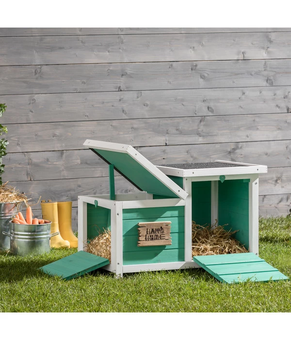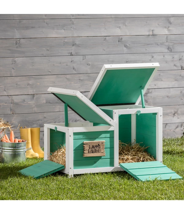 Kleintierschlafhaus, aus lackiertem Tannenholz, mit zwei als Leitern nutzbaren Türen und aufklapparen Bitumendächern