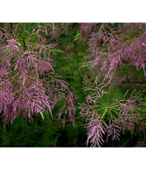 Ist es nicht immer wieder ein fantastisches Erlebnis zu beobachten, wie sich Ihre Frühlings-Tamariske in den Monaten Mai und Juni herausputzt und zum Highlight Ihres Gartens wird? Wie sich die romantisch überhängenden Zweige an dem Busch mit einer solchen Fülle von Einzelblüten schmücken, dass das Holz unter dem rosafarbenen Blütenregen kaum mehr zu sehen ist! Doch auch nach der Blüte ist die Frühlings-Tamariske mit ihren filigranen, schuppenförmigen Blättern und dem locker aufrechten Wuchs eine Zierde im Garten. Tamarisken sind im Mittelmeerraum sowie in Asien zuhause, aber auch in trockenen Gebieten Afrikas sind verschiedene Sorten zu finden. Dennoch verfügen sie über eine gute Frosthärte. Bereichern Sie Ihre Gartenanlage mit diesem spektakulären Blühgehölz und erleben Sie, wie sich die Frühlings-Tamariske aus einer Jungpflanze zu einem stattlichen Gehölz mit einer Wuchshöhe von 2 – 4 m entwickeln wird und als Solitär wie auch als Teil einer gemischten Gehölzgruppe Ihren Garten noch blütenreicher macht!
