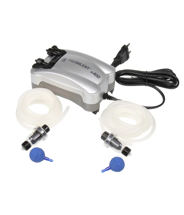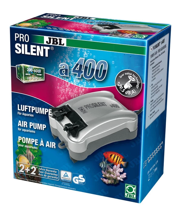 Mit dieser JBL ProSilent a400 Luftpumpe erhalten Sie die beste Luftpumpe für alle Aquarien zwischen 200 und 600 Liter. Die Luftpumpe erzeugt durch das Gewicht, durch die Verbesserung der Schalldämmung und durch die Verwendung von Spezialfüßen für das Pumpengehäuse einen sehr geringen Geräuschpegel. Mit dem 2 x 2 m Schlauch, den zwei Rückschlagventilen und den zwei Sprudelsteinen ist diese neuartige Luftpumpe anschlussfertig. Außerdem besitzt diese ProSilent a400 Luftpumpe zwei Membranen und zwei unabhängig voneinander regelbare Luftausgänge. Die Luftpumpe hat einen Stromverbrauch von nur 3,9 Watt.