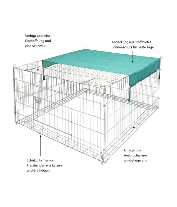 Gerne lässt man seine kleine Fellnassen nicht alleine im Garten zurück, da die Gefahr der Flucht und des Ausbrechens immer relativ groß ist. Mit dem Kerbl Freigehege mit Ausbruchsperre brauchen Sie sich jedoch keinerlei Gedanken mehr zu machen und können Ihre Tiere ruhigen Gewissens im Freien zurück lassen. Das verzinkte Kerbl Freigehege mit Ausbruchsperre bietet optimalen Rundumschutz. Das Kerbl Freigehege mit Ausbruchsperre besitzt zudem eine praktische Gitterabdeckung, welche Ihre Tiere vor natürlichen Feinden wie Greifvögel, Katzen und Madern schützt. Über die aufklappbare Gitterabdeckung des Kerbl Freigehege mit Ausbruchsperre oder den vier seitlichen Türen gelangen Sie ganz einfach in das Innere des Freilaufgeheges, sodass Sie Ihre Fellnasen beispielsweise mit frischem Trinkwasser versorgen können. Falls es im Sommer mal zu heiß wird und Ihre Lieblinge Schatten suchen, können Sie einfach den im Lieferumfang enthaltenen Sonnenschutz über das Gitterdach spannen und schon wird genügend Schatten gespendet. Mit dem leicht versetzbaren Kerbl Freigehege mit Ausbruchsperre können Ihre Fellnasen entspannt viele Stunden im Freien verbringen. Die Montage ist einfach und die Befestigung erfolgt durch Erdspieße.