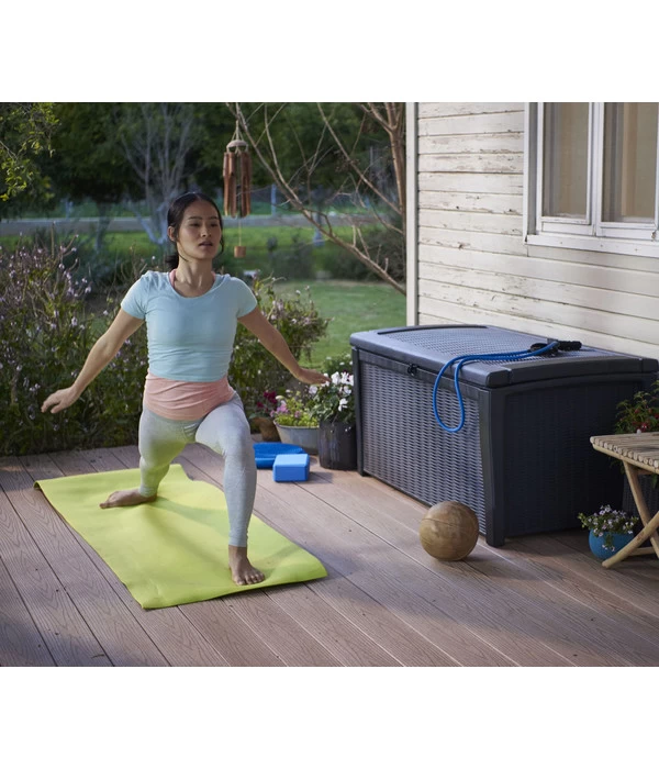 Sie wünschen sich einen Aufbewahrungsplatz für die Sitzpolster Ihrer Gartenmöbel, der gleichzeitig eine echte Zierde auf der Terrasse oder dem Balkon ist? Diese Eigenschaften und noch viele mehr bietet Ihnen die schicke Aufbewahrungsbox Borneo aus dem Hause Keter. Dank ihrer eleganten Optik fügt sich die stylische Box stilvoll in jedes Ambiente. Außerdem ist sie aus Polypropylen gefertigt, witterungs- sowie UV-beständig und lässt sich mit einem Vorhängeschloss bestücken. Neben der klassischen Verwendung als Ablageort für Outdoorkissen können auch hervorragend Dekorationen, Gartengeräte oder das Spielzeug der Kinder in der Keter Aufbewahrungsbox Borneo verstaut werden.