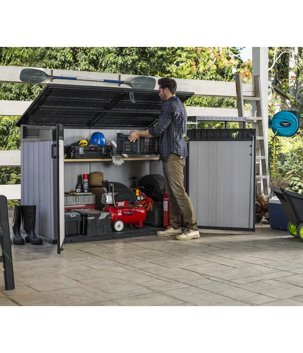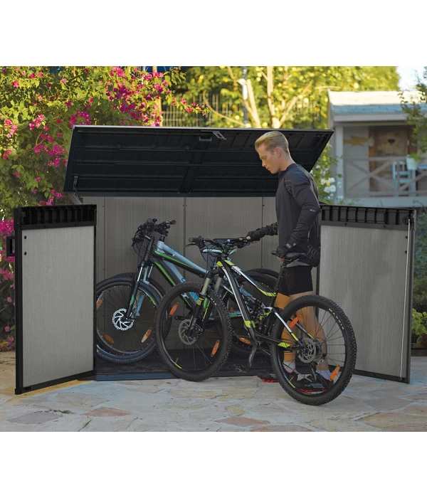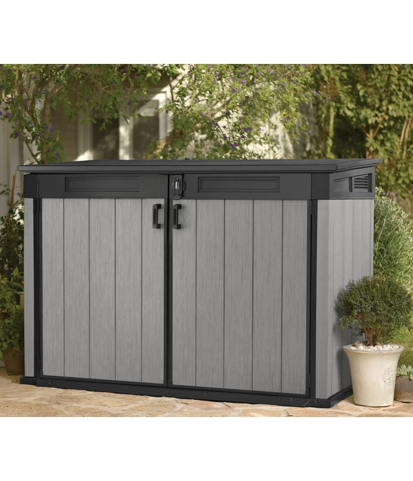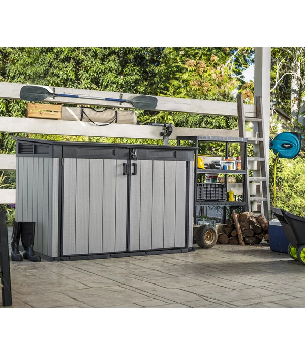 Lieben Sie die Ordnung, wenn alles an seinem Platz ist und fein säuberlich aufgeräumt aussieht? Dann ist die Keter Universal-Aufbewahrungsbox Grande Store mit ihrem Fassungsvermögen von 2100 Litern das richtige Gartenaccessoire für Sie. Platzieren Sie die große Box in natürlicher Holz-Ästhetik in Ihrem Hof oder der Einfahrt und verstauen Sie darin, was gerade im Weg ist. Ihrer Fantasie sind dabei kaum Grenzen gesetzt. Dank Ihres enormen Fassungsvermögens nutzen Sie die Grande Store Aufbewahrungsbox, um Ihre Mülltonnen elegant verschwinden zu lassen oder als Unterstellmöglichkeit für Ihre Fahrräder. Auch Ihre Gartengeräte finden im Keter Aufbewahrungsschrank ein trockenes Zuhause.