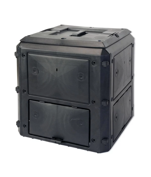 Wenn Sie den KHW Kunststoff-Komposter Bio Quick in Ihrem Garten aufstellen, können Sie mit einem Kompostierbehälter arbeiten, der ein Füllvolumen von 420 Litern hat. Eine gute Größe, wenn Sie bedenken, dass Sie den Kompost durchmischen müssen. Die Mischung des Rottgutes ist sehr wichtig, um den Gärungsprozess gleichmäßig in Gang zu halten. Zur Entnahme des Kompostes besitzt der KHW Kunststoff-Komposter Bio Quick eine praktische Klappe. Die dunkle Farbgebung sowie das Material – dickwandiges Polypropylen-Recyclat in 5 bis 7 Millimeter Stärke – beschleunigen zudem den Kompostierprozess, der Wärme nutzt und erzeugt. Die Lieferung des KHW Kunststoff-Komposters Bio Quick erfolgt in Einzelteilen, der Aufbau gestaltet sich einfach und ist ohne zusätzliches Werkzeug möglich.