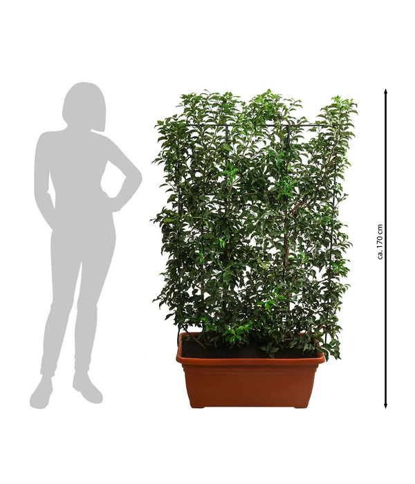 Ein stolz aufrechter Wuchs und dazu ein dichtes, glänzend dunkelgrünes Laubkleid, das in seiner Form und Größe an den echten Lorbeer erinnert – ein Portugiesischer Kirschlorbeer ‚Brenelia‘ ist unbestreitbar der Star unter den Lorbeerkirschen und macht der normalen Kirschlorbeerpflanze heftige Konkurrenz. Denn seine Eleganz geht nicht auf Kosten der anderen guten Eigenschaften wie Robustheit, Wuchsfreude, Winterhärte und noch einige mehr. Und so prachtvoll sich Prunus lusitanica als Solitär in einer Gartenanlage macht, so gerne bildet er zusammen mit einigen Kollegen eine blickdichte, immergrüne Sichtschutzhecke. Ein solch eingespieltes Team können wir Ihnen hier vorstellen, das seit einiger Zeit am Spalier wächst und bereits eine Höhe von 170 cm erreicht hat. So kann Sie das Ziergehölz fast vom ersten Moment an vor neugierigen Blicken, aber auch vor unangenehmem Wind und Lärm schützen. Lassen Sie bald Portugiesischer Kirschlorbeer ‚Brenelia‘ bei Ihnen einziehen und freuen sich jetzt schon aufs nächste Frühjahr, wenn der kräftige Neuaustrieb in leuchtendem Rot einen dekorativen Kontrast zu dem dunklen Grün setzt.