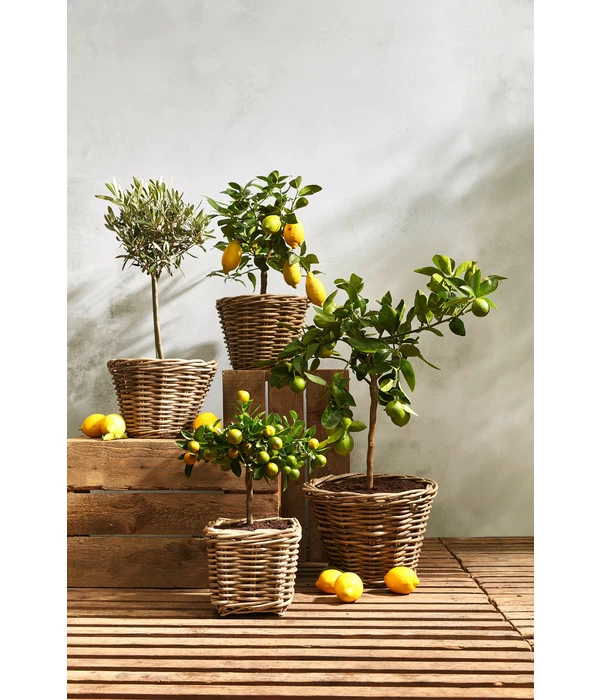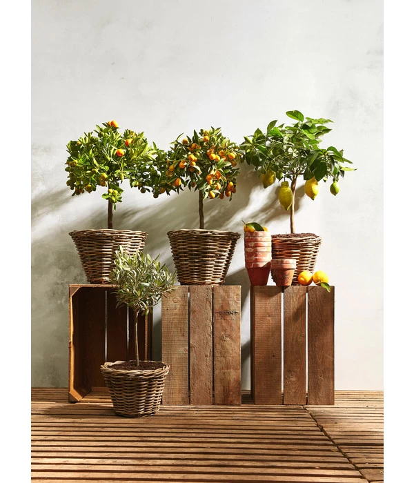 Einen besonders stimmigen Effekt erzielen Sie, wenn Sie in den rustikalen Rattan-Topf Blumen setzen, die ländlichen Charme versprühen. Das können im Frühling blaue Traubenhyazinthen oder Ranunkeln sein, die im Sommer von Schleierkraut oder Wolfsmilch abgelöst werden. Auch drei prächtige Sonnenblumen passen wunderbar zum Flair dieses Topfs. Im Herbst lassen Sie leuchtende Astern folgen und im Winter arrangieren Sie pinkfarbene Heide mit silbrigem Gitterkraut und grüner Rebhuhnbeere im Rattan-Topf, die leuchtend rote Früchte zum winterlichen Bild beisteuert. Möchten Sie den Rattan-Topf nicht bepflanzen, können Sie auch einfach nur die Töpfchen hineinstellen und die Zwischenräume mit etwas Moos überdecken.
