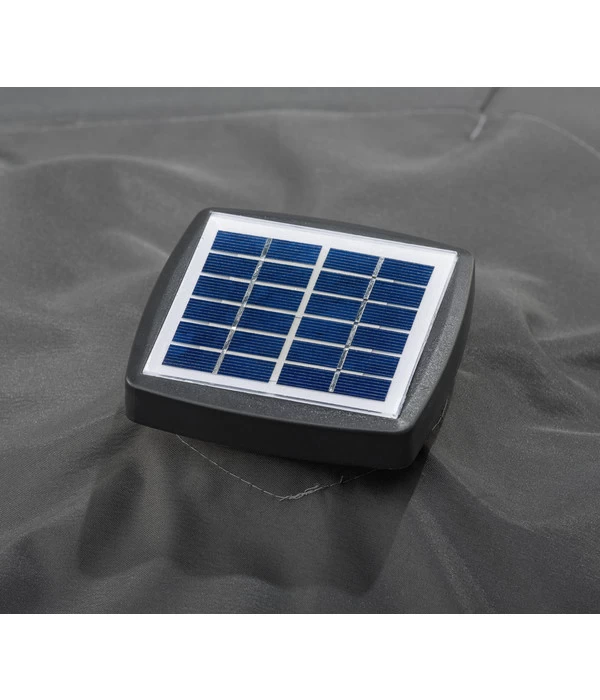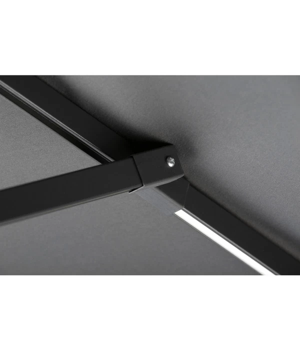 Regeln Sie jetzt mit dem Schneider Sonnenschirm Blacklight die Lichtverhältnisse in jeder Situation. Denn dieser LED-Sonnenschirm verfügt über eingebaute Lichtleisten in den Streben, welche mit drei AA-Akkus im eigenen Solartop versorgt werden. So sammelt der Schneider Sonnenschirm Blacklight am Tag die nötige Energie, wenn er Sie vor der Sonne schützt, und gibt diese dann am Abend als Licht wieder ab. Der moderne Schirm besteht aus reinem Polyester und wiegt knapp 180 g/m². Das Mittelrohr setzt sich aus einem 2-teiligen Stock zusammen und wird aus pulverbeschichtetem Aluminium hergestellt. Der obere Teil ist abknickbar und gibt Ihnen so die Möglichkeit, stets den besten Winkel für optimale Schattenverhältnisse zu wählen. Unter dem Schneider Sonnenschirm Blacklight werden Sie und Ihre Haut mit einem UV-Faktor 50+ geschützt – so müssen Sie sich auch keine Sorgen über einen Sonnenbrand machen. Der pflegeleichte Sonnenschirm kann einfach demontiert werden, um das Polyestergewebe mit einer sanften Handwäsche zu reinigen.