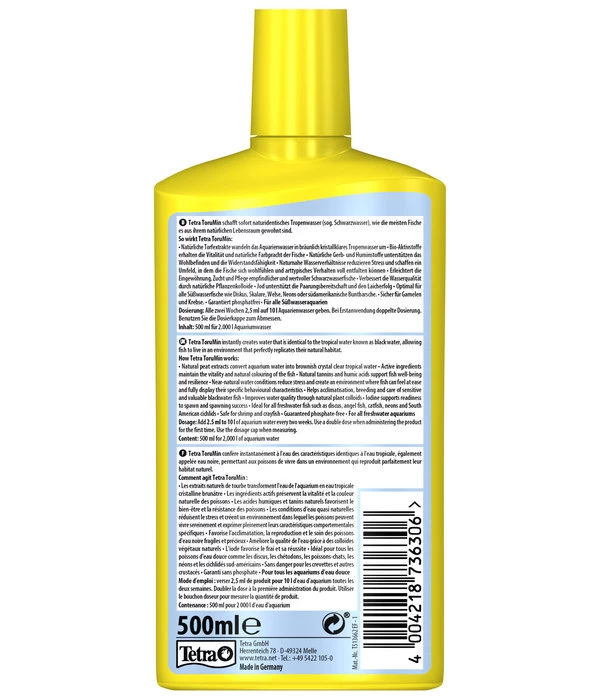 Schwarzwasser ist der Lebensraum wertvoller tropischer Fische und Wasserpflanzen. Um einen naturidentischen Lebensraum in Ihrem Aquarium zu erschaffen, eignet sich das aus natürlichen Torfextrakten bestehende Mittel ToruMin von Tetra. Durch spezielle Bio-Aktivstoffe fördert es bei Fischen die Farbenpracht und das artentypische Verhalten. Bei regelmäßiger, richtiger Anwendung verfärbt sich das Wasser in Ihrem Aquarium bräunlich, bleibt aber kristallklar, so dass der Lichteinfall reduziert und die Algenbildung gehemmt wird. Wasserpflanzen gedeihen besser, dank der ausgewählten Makro- und Spurenelemente.