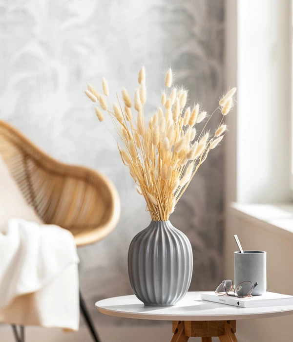 Wenn die Blütezeit im Garten langsam zu Ende geht und es draußen immer ungemütlicher wird, würden Sie am liebsten alle Blüten, Gräser und Samenstände mit ins Haus nehmen, sie „retten”, bevor sie zerfallen oder ihre Farbe verlieren. Beschenken Sie sich stattdessen doch einfach mit Trockenblumen wie diesem feinen Bündel mit Hasenschwanzgras. Dabei handelt es sich um die uns allen wohlbekannten Ähren, die so weich und flauschig aussehen, dass man sie unbedingt berühren möchte. Filigrane Schmuckstücke, die getrocknet noch genauso so schön sind, wie sie es zu Lebzeiten waren und mit denen sich unendlich viele Deko-Möglichkeiten eröffnen. Trockenblumen wie das Hasenschwanzgras zeichnen sich durch ihre attraktive Silhouette aus und bringen einen natürlichen Look in Ihre Raumdekoration. Besonders beliebt sind sie selbstverständlich auch deshalb, weil sie keinerlei Pflege brauchen, fast ewig halten und sich mit ihnen sogar Gefäße schmücken lassen, die nicht wasserdicht sind. Legen Sie also schon bald los und lassen Sie Ihre Ideen mit Hilfe von getrocknetem Hasenschwanzgras Gestalt annehmen.