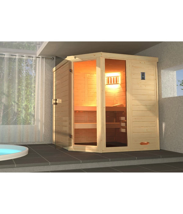 Mit der Marke Weka setzen Sie nicht nur auf die langjährige Erfahrung eines Spezialisten, sondern auch auf die hohe Qualität der verwendeten Materialien und auf ein hochwertiges Design. Die Sauna Laukkala mit Glastür und Fenster kann mit ihrem einfallsreichen Grundriss sowohl an einer geraden Wand als auch in einer Raumecke stehen. Sie wurde aus massiven, naturbelassenen Fichtenholz-Blockbohlen gefertigt und mit Glaselementen aus Sicherheitsglas versehen. Die beiden Liegen sind auf unterschiedlichen Höhen angebracht – für Ihren individuellen Wärmegenuss.