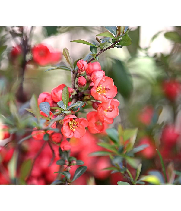 Der ambitionierte Gärtner, der mit mehreren Sinnen zugleich genießen möchte, schätzt die Zierquitte besonders wegen ihrer Vielseitigkeit: Nicht nur präsentiert sie sich als liebliche Augenweide, auch überzeugt sie durch ihren praktischen Nutzen. Im Frühling begeistert dieses schicke Gehölz mit auffallend großen, gefüllten Schalenblüten, welche von Mai bis Juni in Orange-Rot erstrahlen. Im Herbst jedoch erlebt die Zierquitte mit ihren leckeren Früchten ein echtes Comeback. Das aromatisch duftende Obst ist nämlich nicht nur zum Ansehen da, sondern kann auch geerntet und weiterverarbeitet werden. In klassischen, aber auch in modernen Kochbüchern, gibt es viele Rezepte für schmackhafte Quittengelees oder Kuchen. Die strauchförmig bis 1,5 m hoch wachsende Zierquitte kann im Garten sehr gut alleine stehen, aber auch als romantisch blühende Hecke ins Gartenkonzept mit eingebunden werden.
